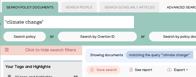 You can create your own tags to organise results from the ‘Policy Documents’ and ‘Scholarly Articles Cited in Policy’ search. You will see a ‘Tag this’ option underneath your search results.