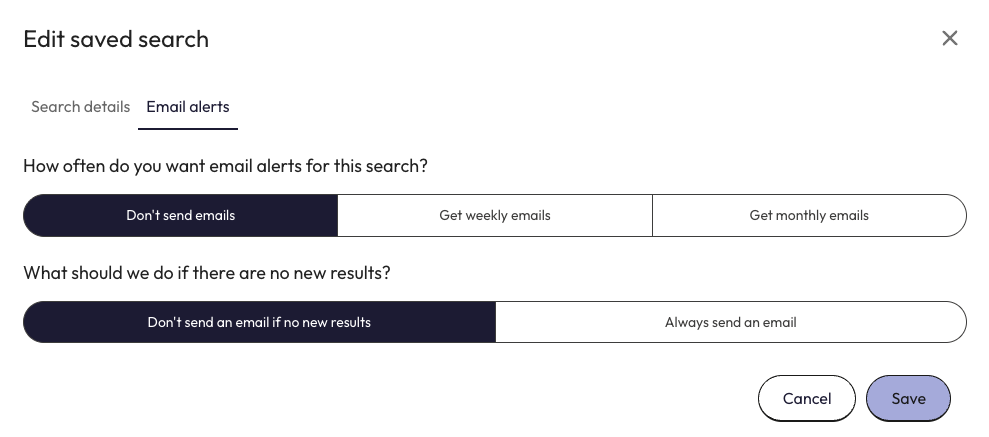 You can choose no emails, weekly emails or monthly emails. You can also decide whether or not you want to be sent an email even if there are no new results.