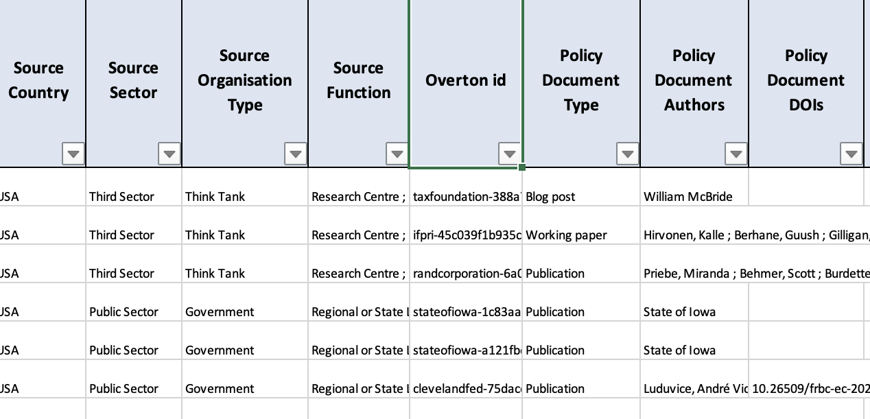 We assign every policy document in our database a unique identifier called an Overton ID. This identifier is assigned at the document level (some policy documents are made up of multiple PDFs).