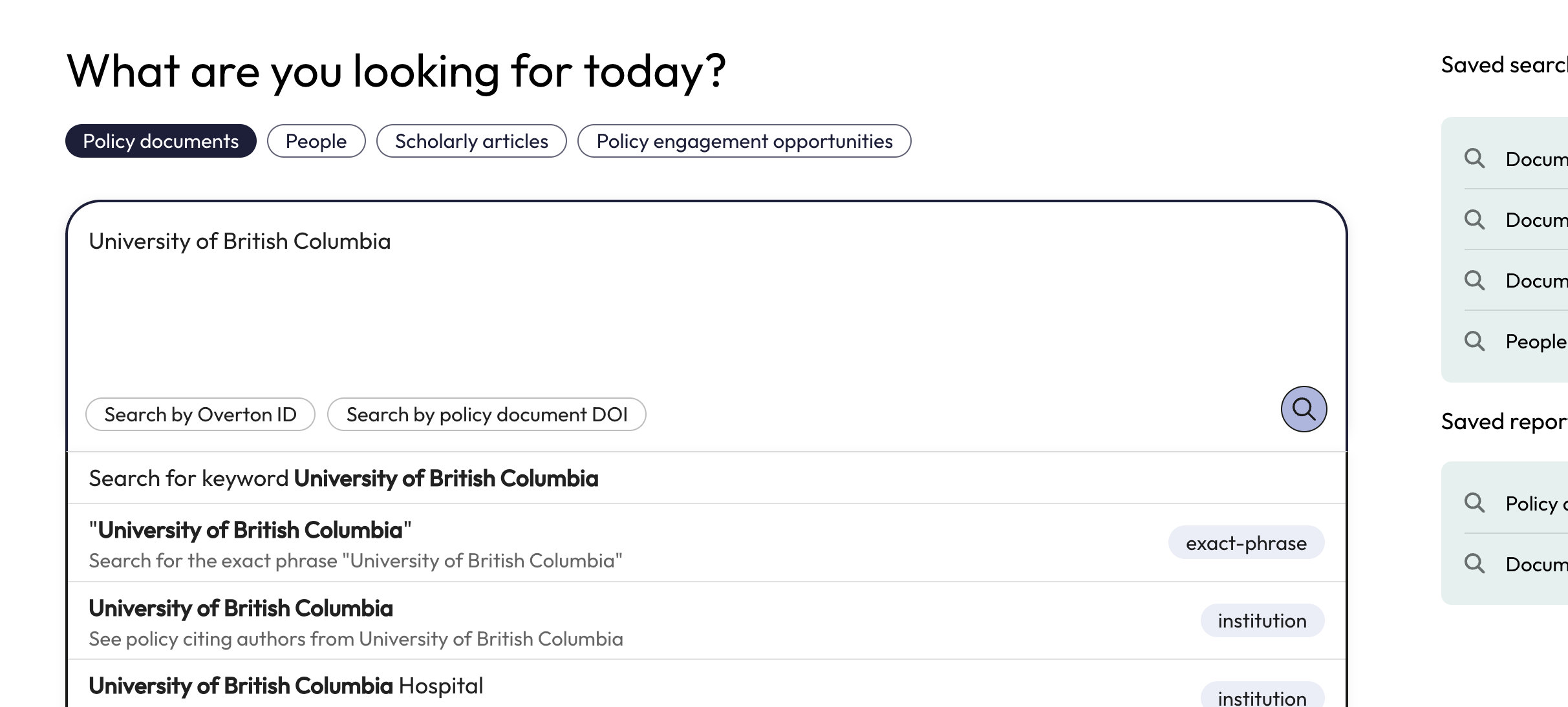 Search for your organisation’s name using the search box or by applying the ‘Cites or mentions institution filter’.