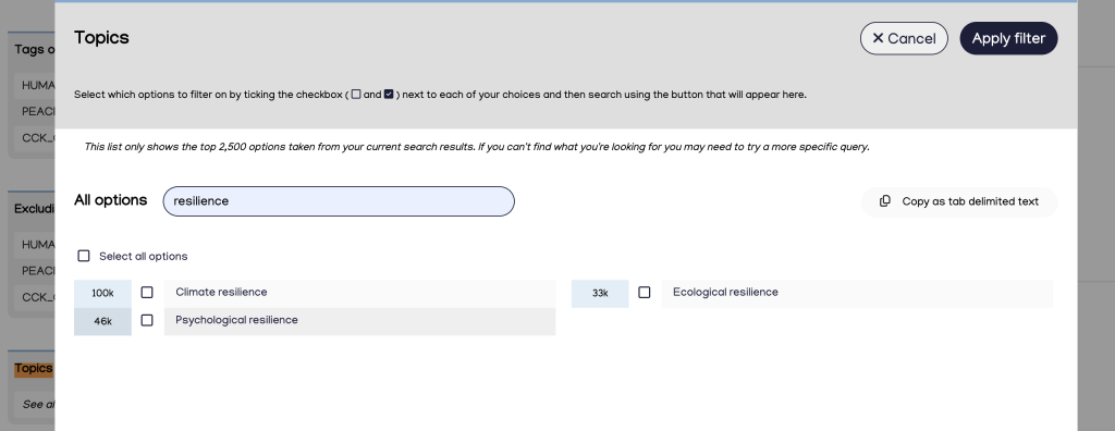For example, after searching for the keyword “resilience,” the topics filter reveals additional options like “urban resilience” and “resilience (engineering and construction)” that weren’t visible in the initial topic list.