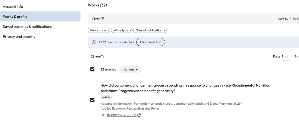 Once you set up your Overton Profile, you can use it to quickly search for policy documents that cite all or selected published works, helping you track the real-world policy impact of your research.