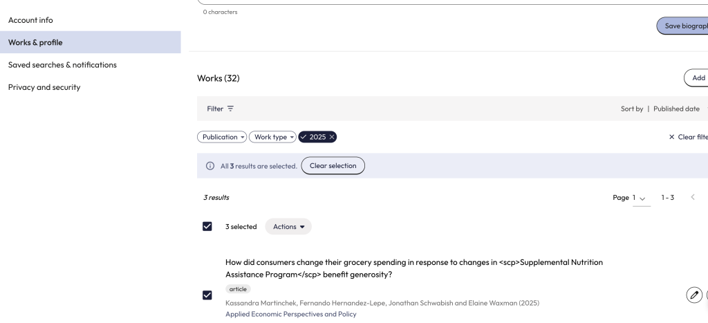 From ‘Works & profile’, you can search for policy citations for all your published works by clicking on ‘Select all’.