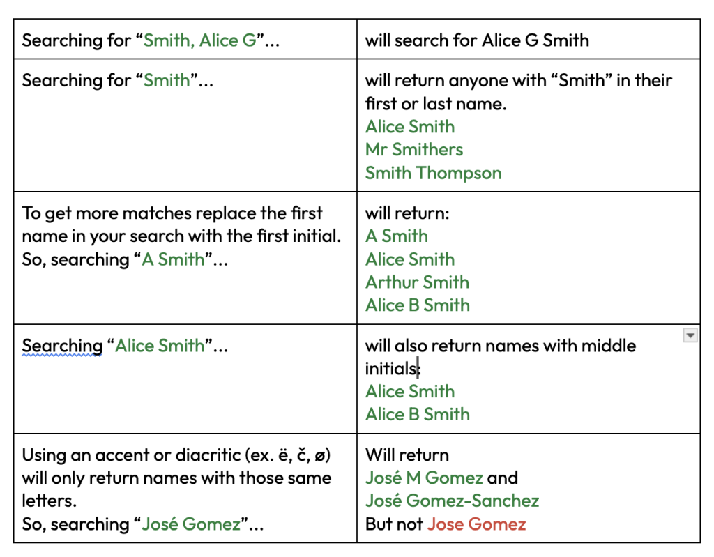 Searching ‘José Gomez’ will return results for ‘José M Gomez’ and ‘José Gomez-Sanchez’ but not ‘Jose Gomez’.
