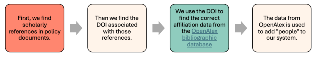 If we can (1) find a DOI associated with a scholarly reference and (2) find affiliation information associated with that DOI in OpenAlex, then a person will appear in the People results.