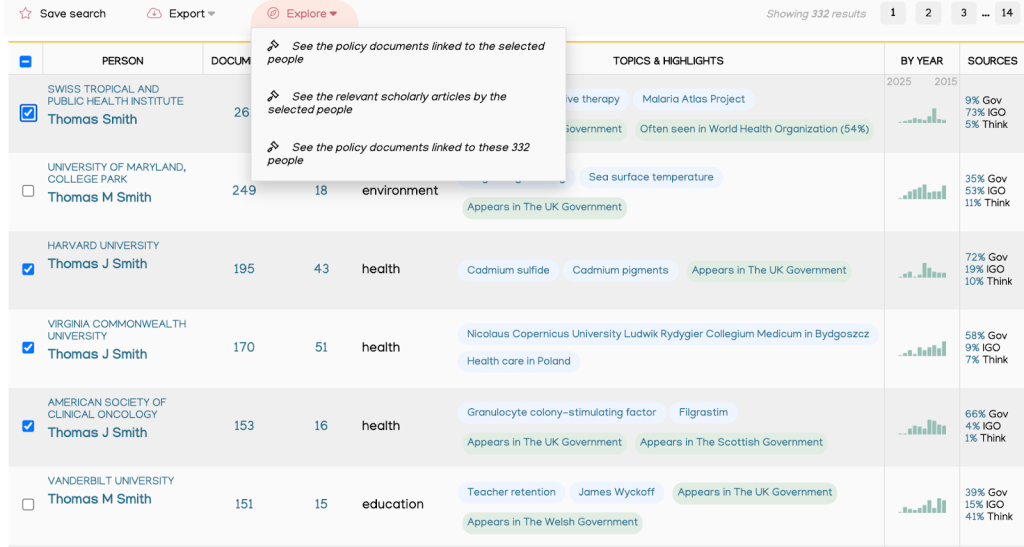 Select the entries that match the individual you are looking for, then click ‘Explore’ to view the related policy documents or scholarly articles linked to those profiles.