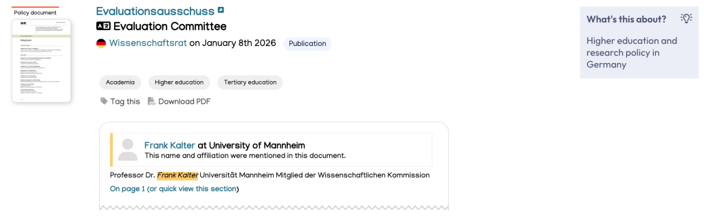 The Overton index allows you to track mentions of people in policy documents, in addition to formal citations.